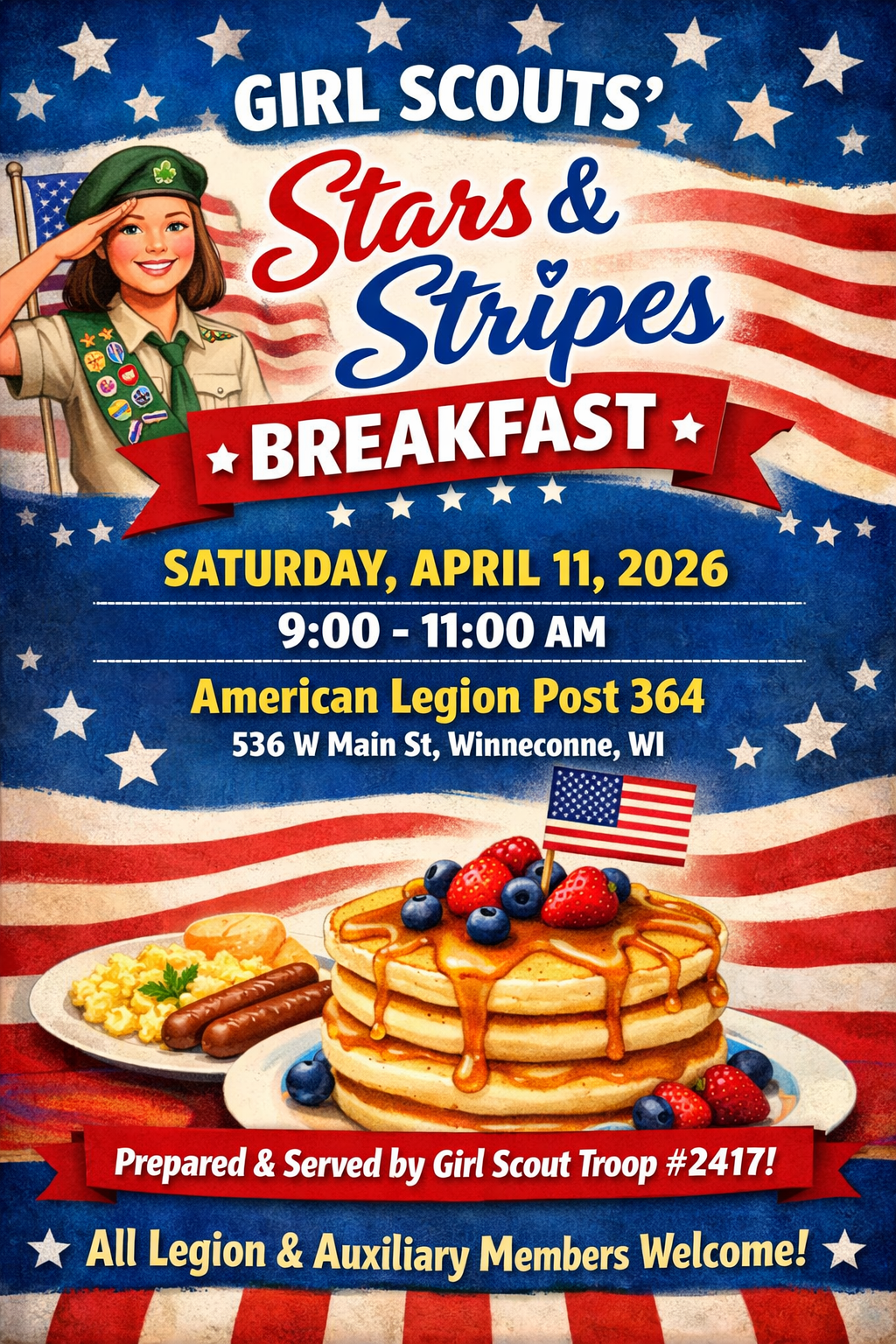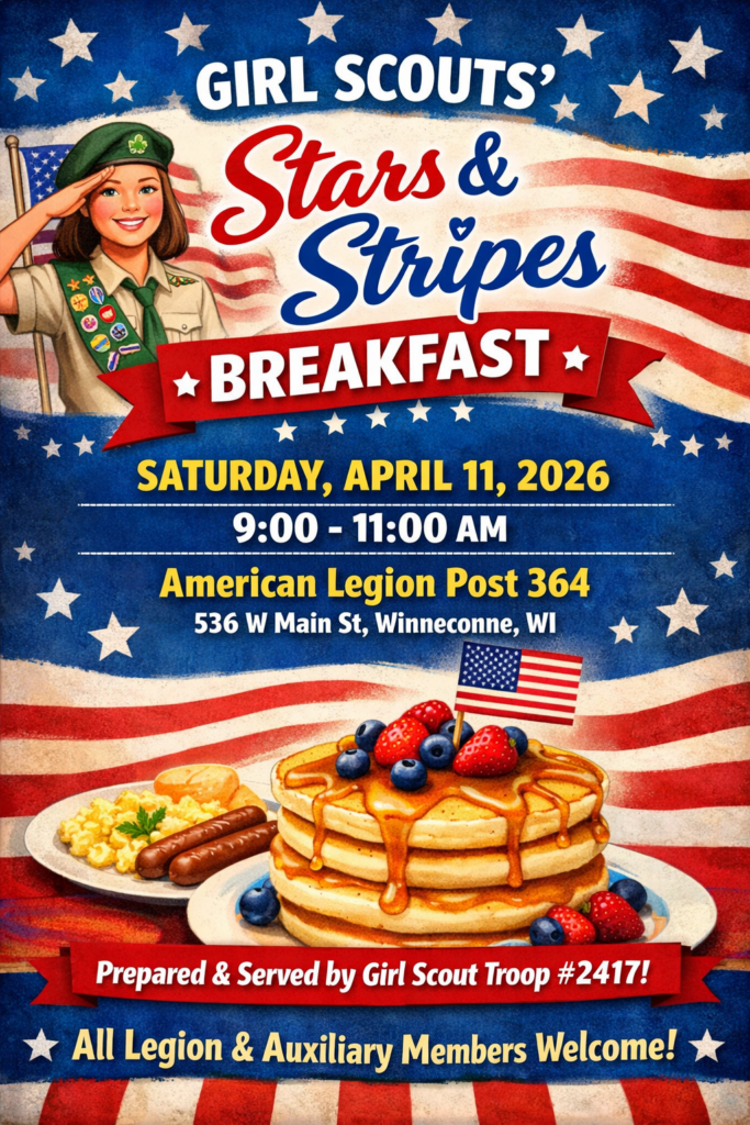 Legion and Auxiliary members are invited to join us on Saturday, April 11th for the Girl Scouts’ Stars & Stripes Breakfast at the Post. Enjoy a morning of pancakes, syrup, and sausage as the girls of Girl Scout Troop #2417 prepare and serve breakfast in appreciation of our U.S. military veterans.